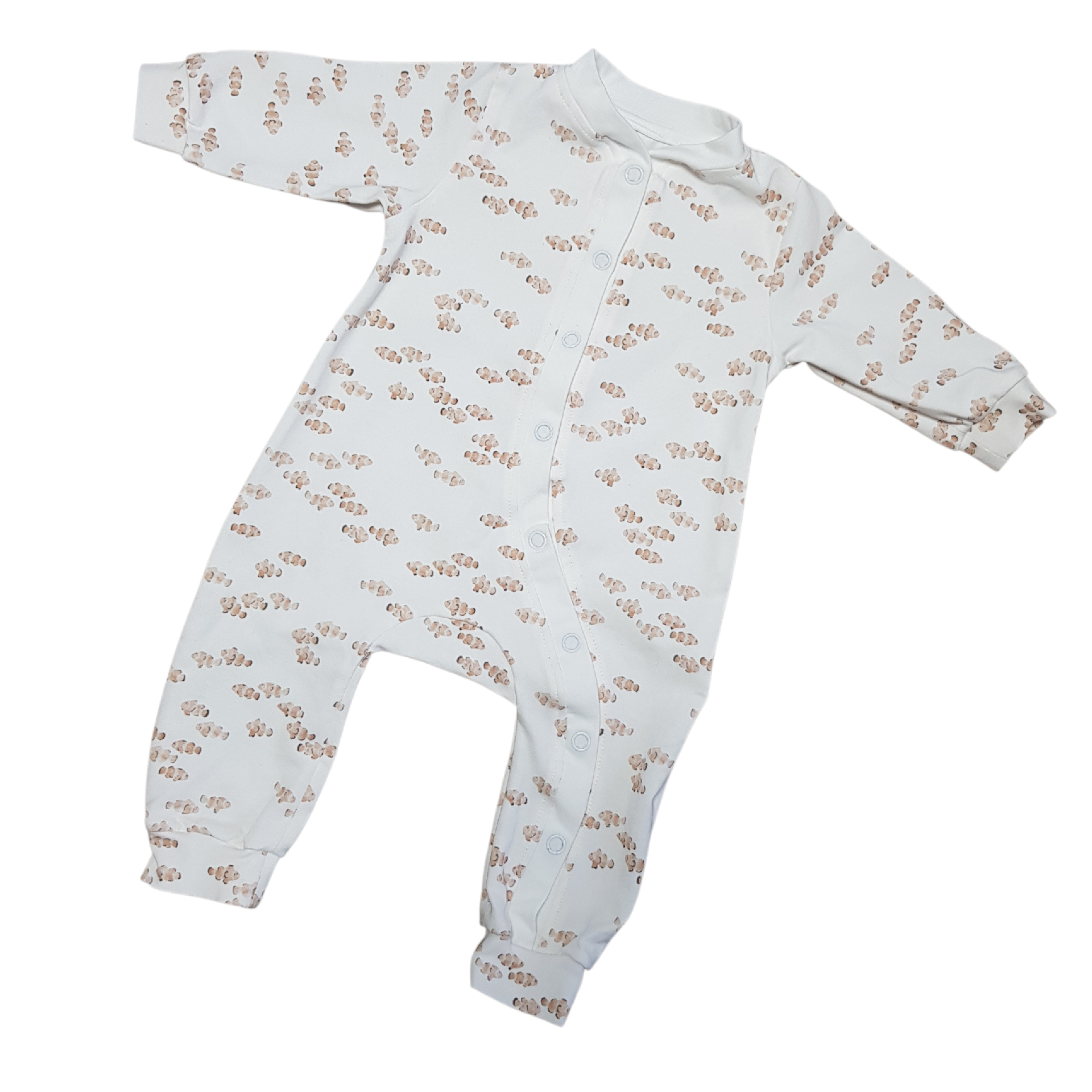 Wat zou dit boxpakje toch prachtig zijn voor je kindje! Van boven tot onder met drukknoopjes te openen. Zacht en comfortabel, met een print van clownvissen in maat 50.