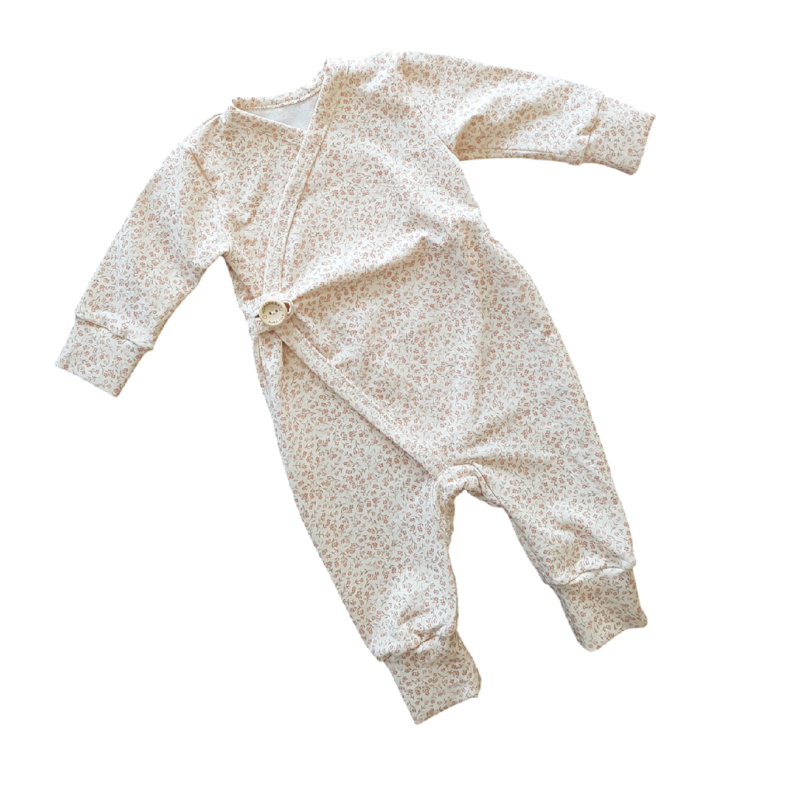 Wat zou dit boxpakje toch prachtig zijn voor je kindje! Heel makkelijk aan en uit te doen door de enkele sluiting met een knoop en één drukknoopje aan de binnenkant. Zacht en comfortabel, crèmewit met een subtiele print van kleine perzikkleurige bloemetjes in maat 50.