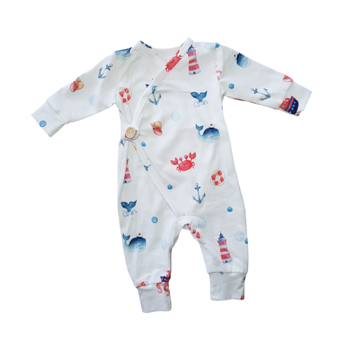 Wat zou dit boxpakje toch prachtig zijn voor je kindje! Heel makkelijk aan en uit te doen door de enkele sluiting met een knoop en één drukknoopje aan de binnenkant. Zacht en comfortabel, helderwit met felgekleurde print van het leven op zee; bootjes, inktvis, boei in maat 50.