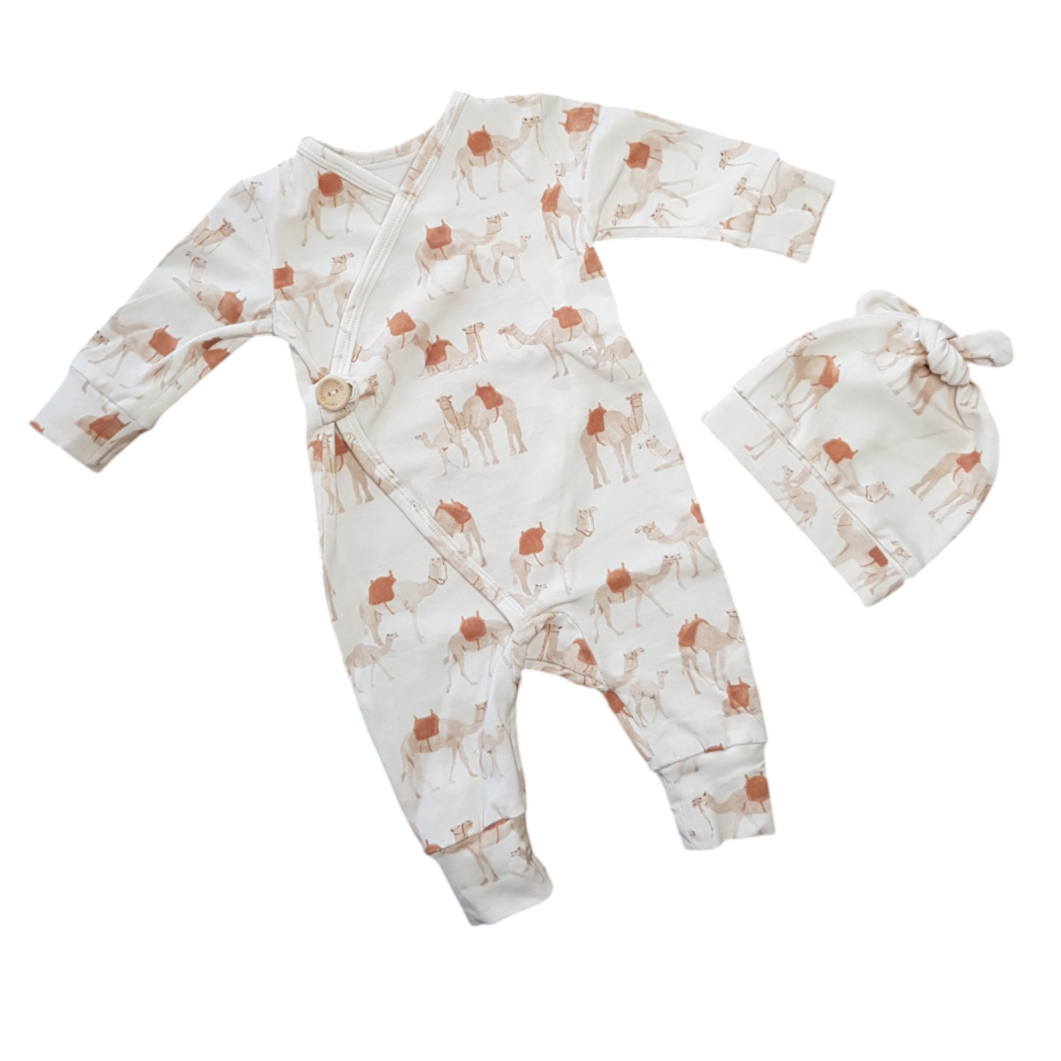 Wat zou dit boxpakje toch prachtig zijn voor je kindje! Heel makkelijk aan en uit te doen door de enkele sluiting met een knoop en één drukknoopje aan de binnenkant. Zacht en comfortabel, crèmewit met een print van dromedarissen in maat 50. De outfit is helemaal af door de combinatie met het bijpassende mutsje. Â