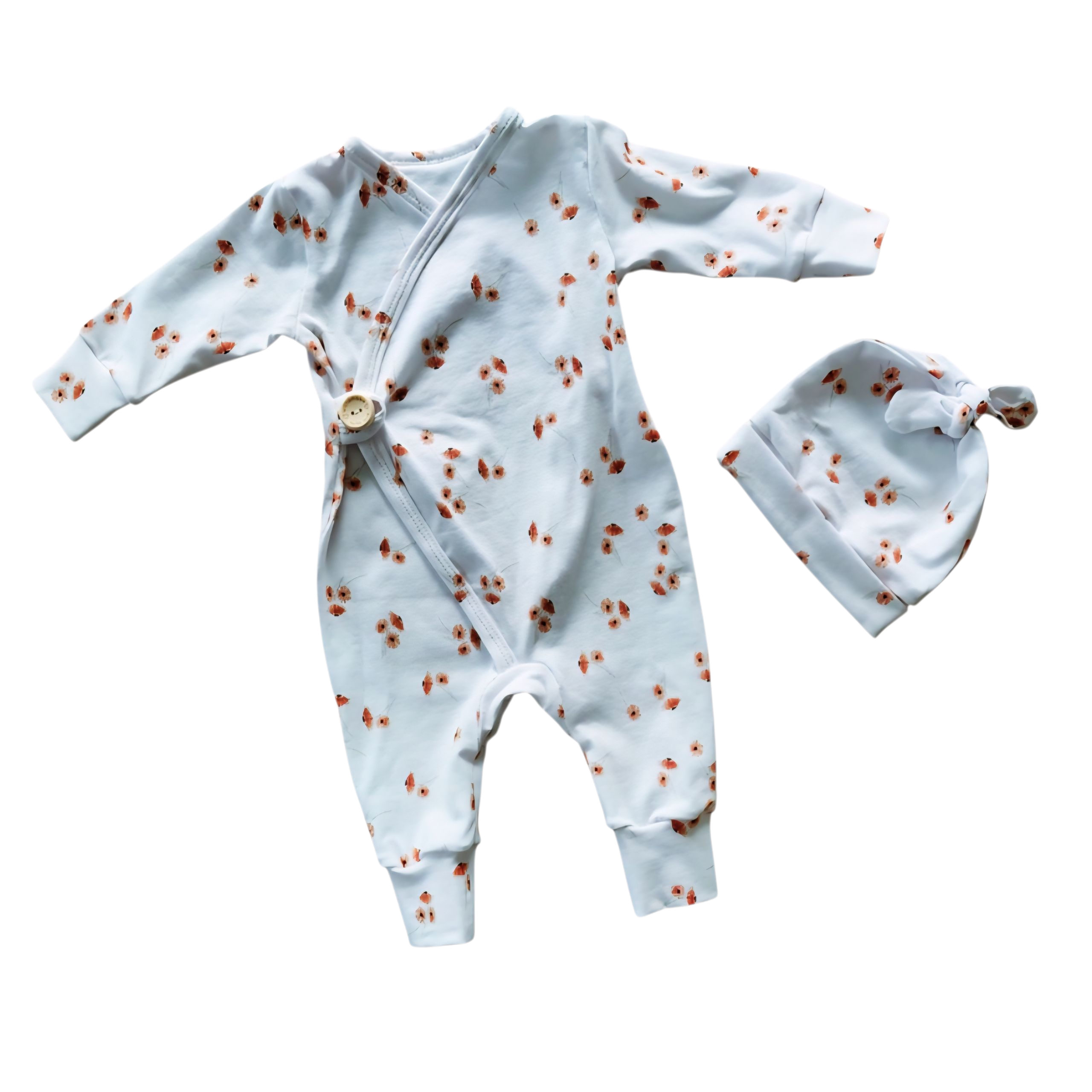 Wat zou dit boxpakje toch prachtig zijn voor je kindje! Heel makkelijk aan en uit te doen door de enkele sluiting met een knoop en één drukknoopje aan de binnenkant. Zacht en comfortabel, helderwit met een lieve print van koraalrode gerbera’s in maat 50. De outfit is helemaal af door de combinatie met het bijpassende mutsje.