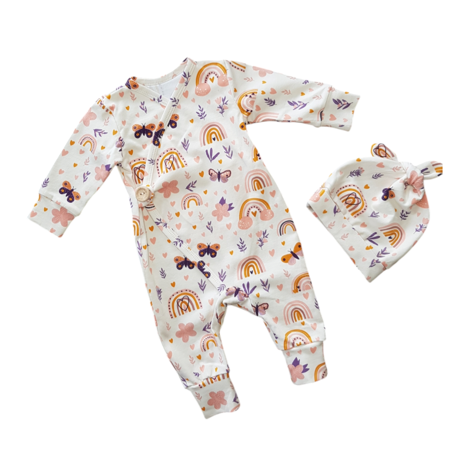 Wat zou dit boxpakje toch prachtig zijn voor je kindje! Heel makkelijk aan en uit te doen door de enkele sluiting met een knoop en één drukknoopje aan de binnenkant. Zacht en comfortabel, crèmewit met een lieve print van regenbogen, hartjes, vlinders en bloemen in maat 50. De outfit is helemaal af door de combinatie met het bijpassende mutsje.Â