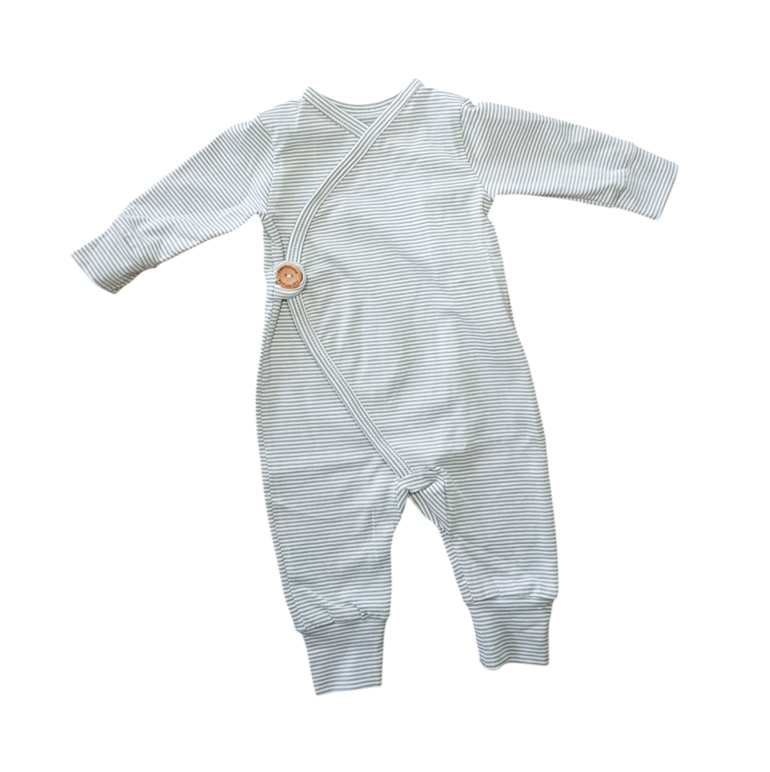 Wat zou dit boxpakje toch prachtig zijn voor je kindje! Heel makkelijk aan en uit te doen door de enkele sluiting met een knoop en één drukknoopje aan de binnenkant. Zacht en comfortabel, met een print van crèmewitte en mintgroene streepjes in maat 50.Â