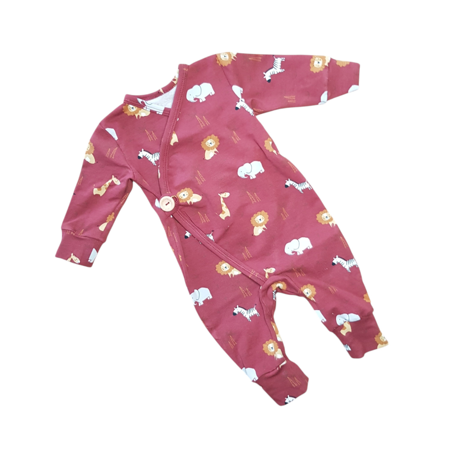 Wat zou dit boxpakje toch prachtig zijn voor je kindje! Heel makkelijk aan en uit te doen door de enkele sluiting met een knoop en één drukknoopje aan de binnenkant. Zacht en comfortabel, bordeauxrood met een print van safaridieren (olifant, leeuw, zebra, giraffe) in maat 50.Â