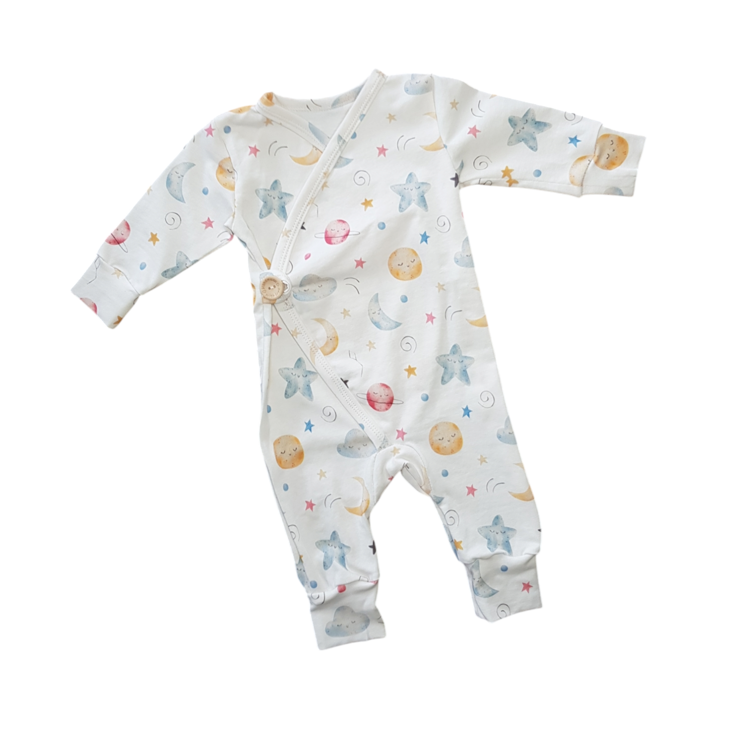 Wat zou dit boxpakje toch prachtig zijn voor je kindje! Heel makkelijk aan en uit te doen door de enkele sluiting met een knoop en één drukknoopje aan de binnenkant. Zacht en comfortabel, crèmewit met een print van zon, maan, sterren en planeten in maat 50.Â