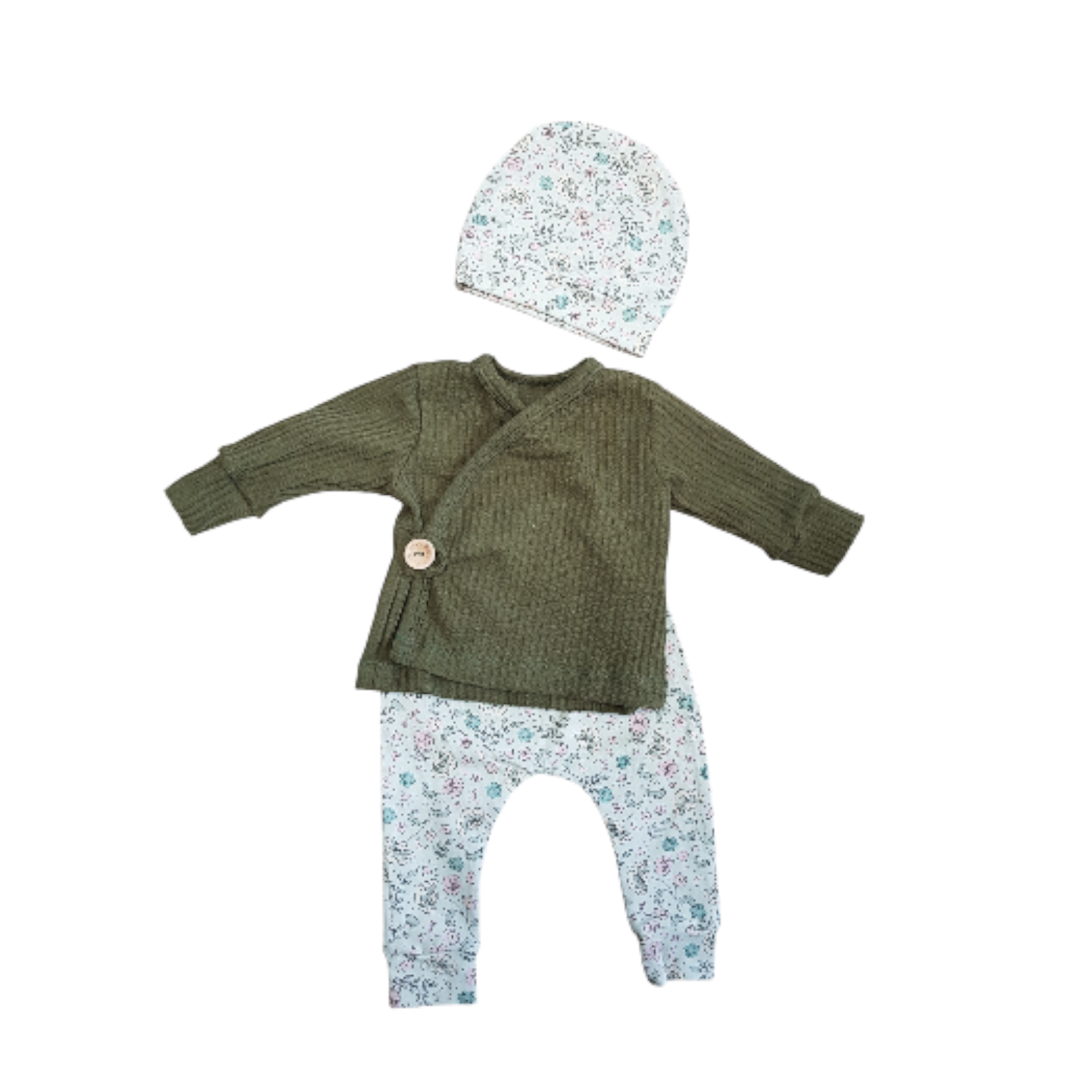 Setje overslagshirt, broekje en muts mintgroene bloemetjes khaki maat 50