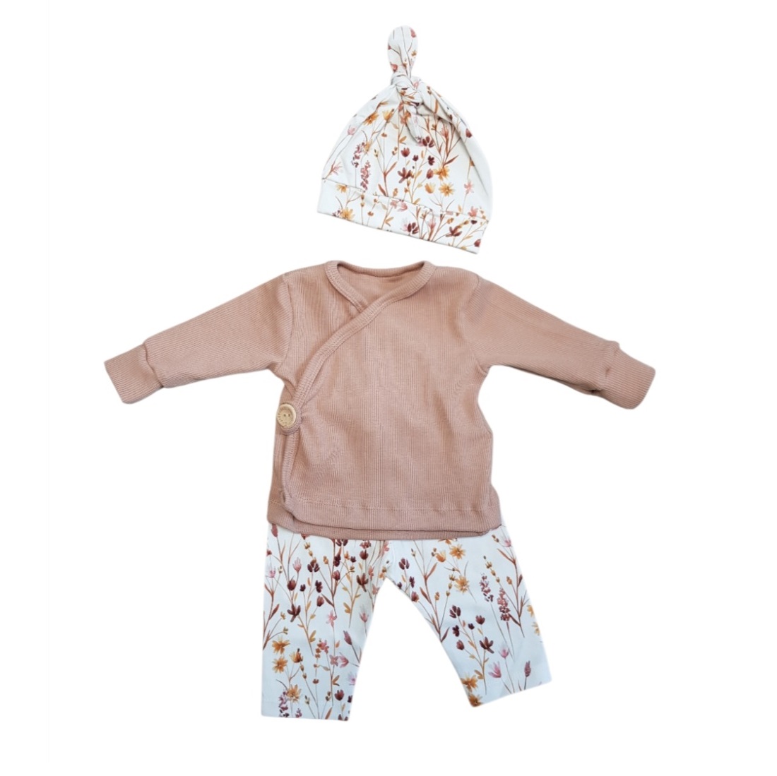 Setje overslagshirt, broekje en muts veldbloemen zalm maat 50