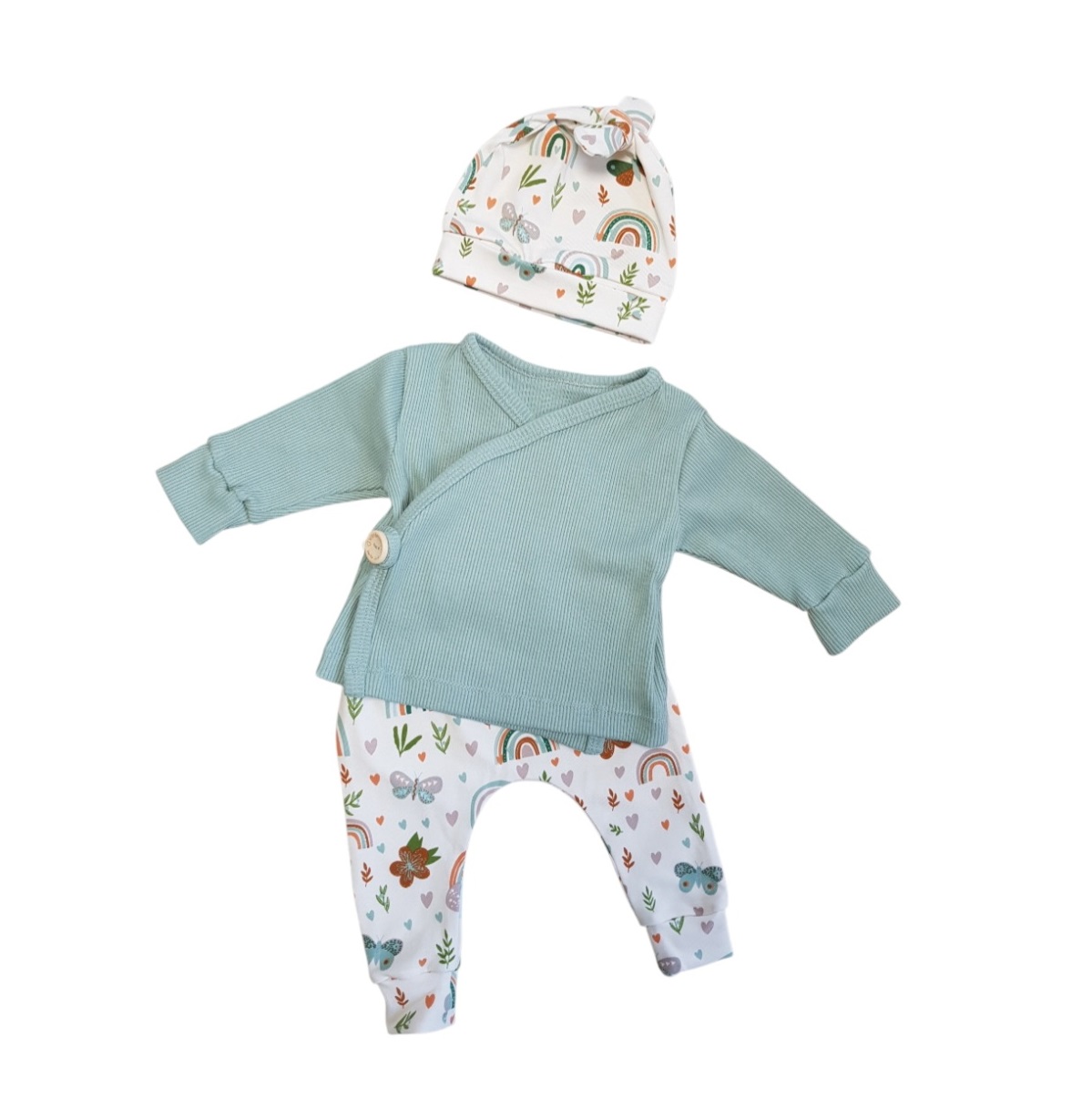 Een fijn en wat ruimer vallend broekje, zodat ook eventuele wasbare luiers er goed in passen. Zacht en comfortabel, met een print van bloemen, vlinders en regenbogen in maat 50. De outfit is helemaal af door de combinatie met het bijpassende overslagshirt in zachte mintgroene ribstof en mutsje in dezelfde print als de broek.